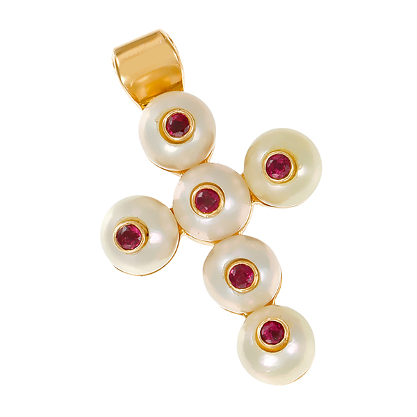 Anhänger, Kreuz, 18K, Gelbgold, Perle, Rubin