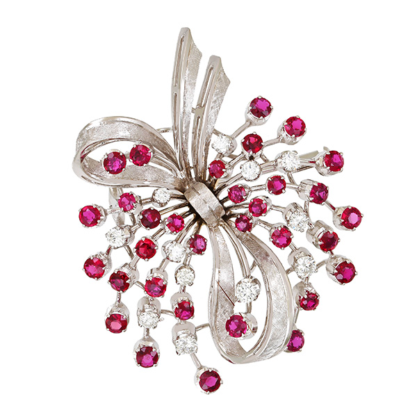 Brosche, 18K, Weißgold, Brillanten, Rubine