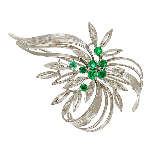 Brosche, 14K, Weißgold, Diamant, Smaragd
