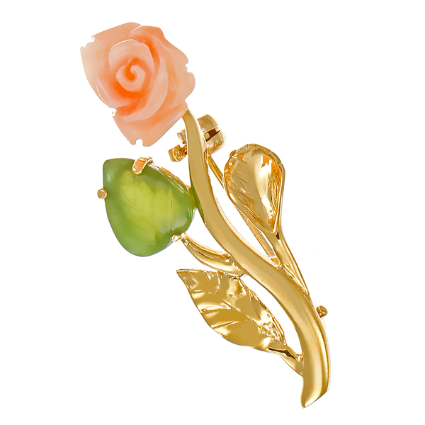 Brosche, 14K, Gelbgold, Nephrit, Koralle, Rose