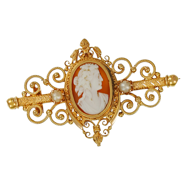 Brosche, 14K, Gelbgold, Anik, Gemme, Perlen