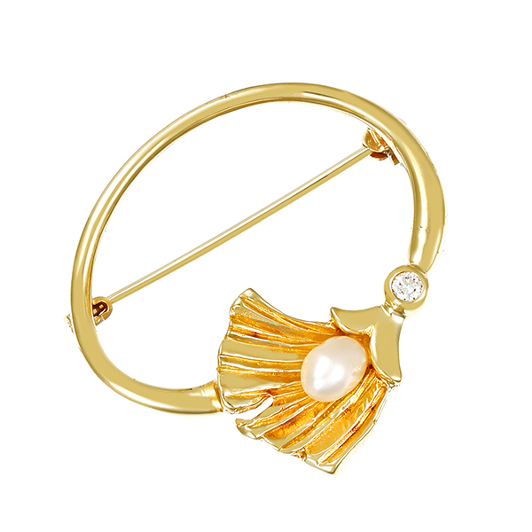 Brosche, 14K, Gelbgold, Perle, Brillant, Ginkgo