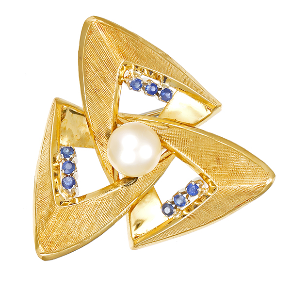 Brosche, 18K, Gelbgold, Perle, Saphire