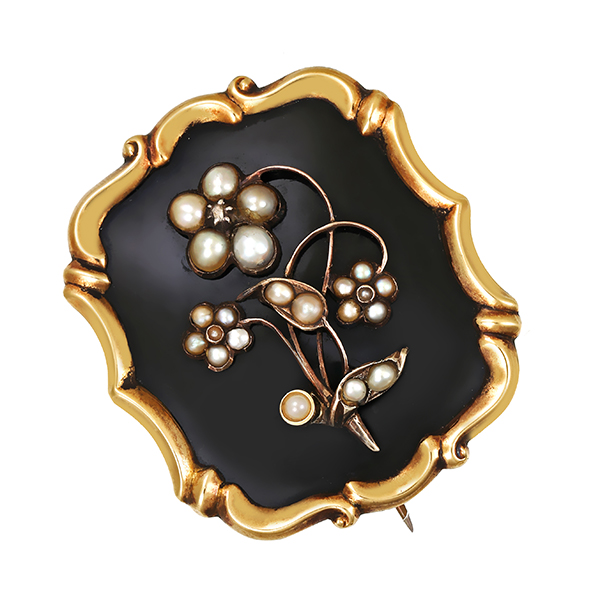 Brosche, 14K, Gelbgold, Onyx, Perlen, Diamantrose