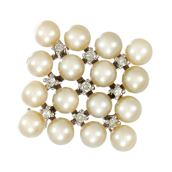 Brosche, 14K, Weißgold, Diamanten, Perlen