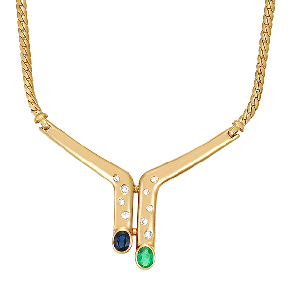 Collier, 14K, Gelbgold, Saphir, Smaragd, Brillant