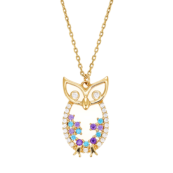 Collier, 14K, Gelbgold, Zirkonia, Schmucksteine, Eule