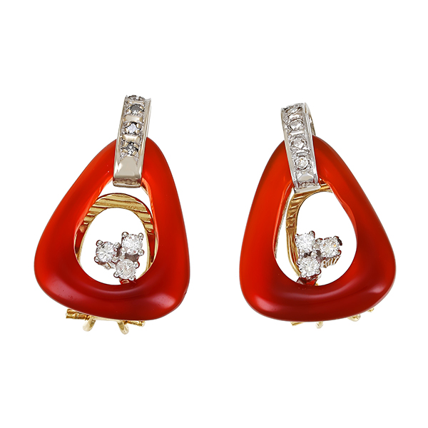 Ohrclips, 14K, Gelb,- Weißgold, Karneol, Brillanten 0,18ct, Diamanten 0,08ct