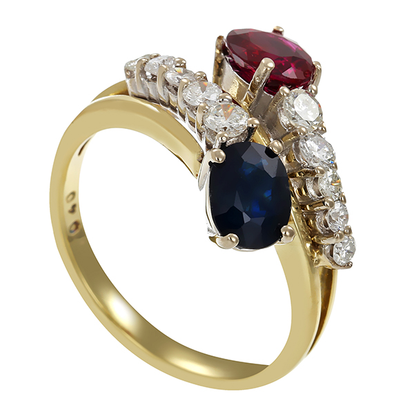 Ring, 14K, Gelb-/Weißgold, Rubin, Saphir, Brillanten, 0,40ct