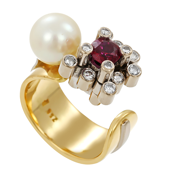 Ring, 18K, Gelb-/Weißgold, Rubin, Perle, Brillanten
