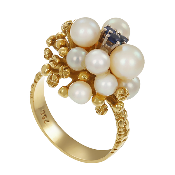 Ring, 18K, Gelbgold, Perlen, Saphir