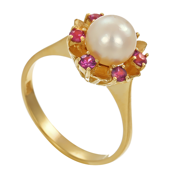 Ring, 18K, Gelbgold, Perle, Rubine
